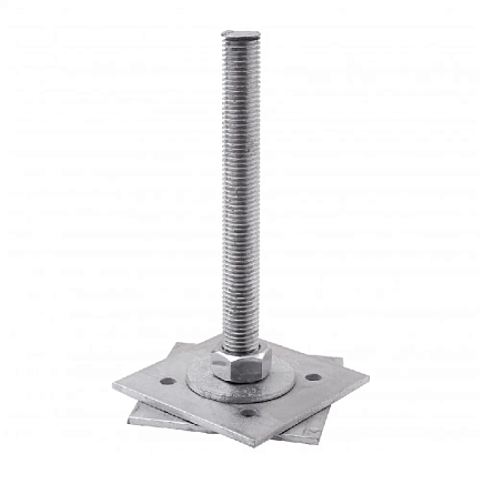 Крепеж состоит из двух металлических пластин, которые называются – опорная и ответная. Пластины перфорированы отверстиями, в которые вкручиваются шурупы для надежного и крепкого крепления. Пластины соединены между собой металлической трубой, которая обеспечивает надежное и стойкое положение столба.